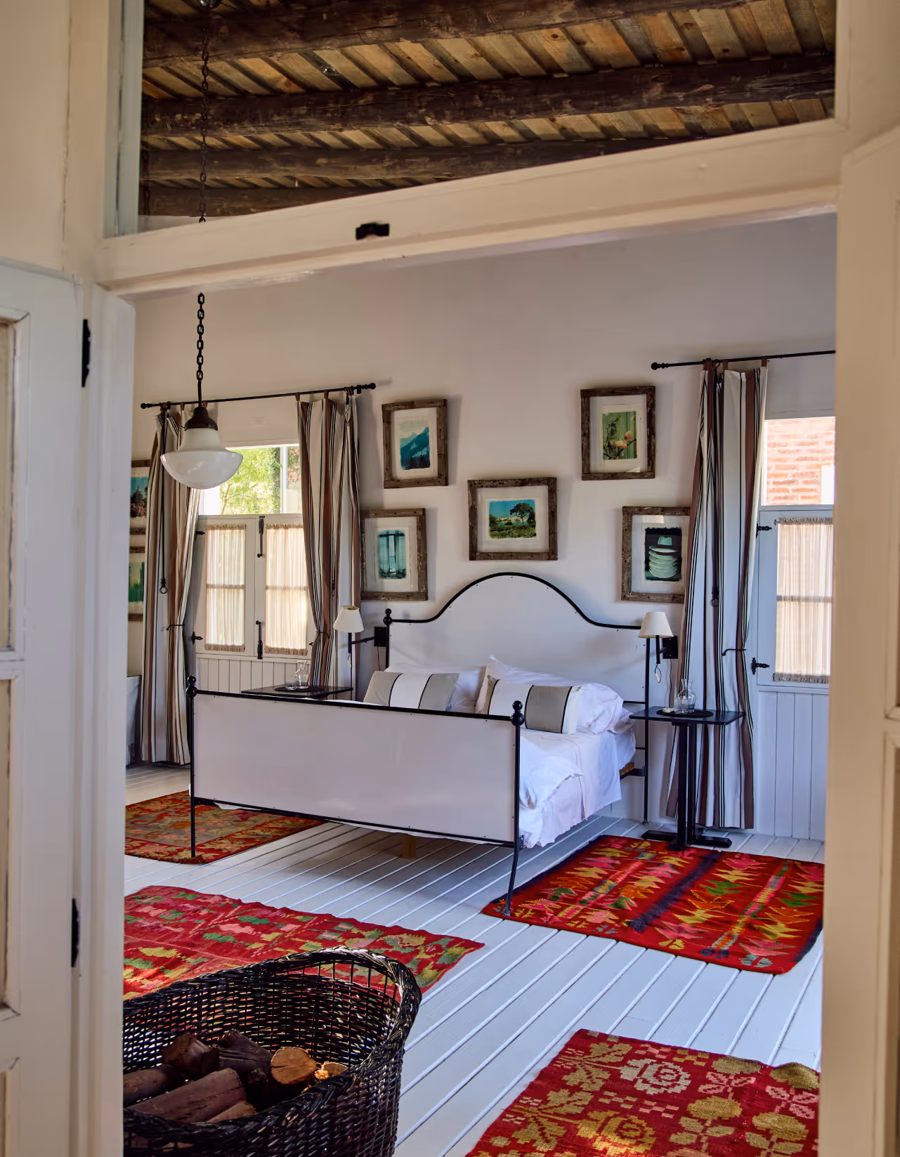 A spacious and bright double room featuring a queen bed, air conditioning, and a living room with a charming chiminea. Windows offer serene views of the garden.